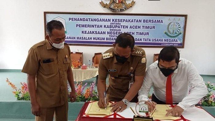 Pemerintah Kabupaten (Pemkab) Aceh Timur dan Kepala Kejaksaan Negeri (Kajari) setempat menandatangani naskah kerja sama penanganan masalah hukum ...