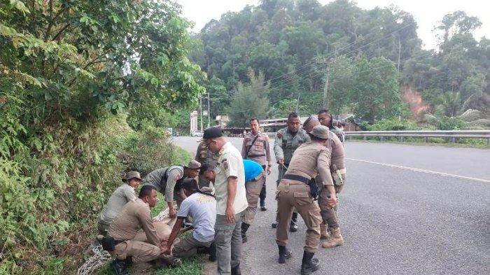Petugas Satpol PP bersama Tim Terpadu melakukan penertiban ternak di sepanjang Jalan Nasional Banda Aceh-Meulaboh dari Kecamatan Jaya, Indra Jaya, ...