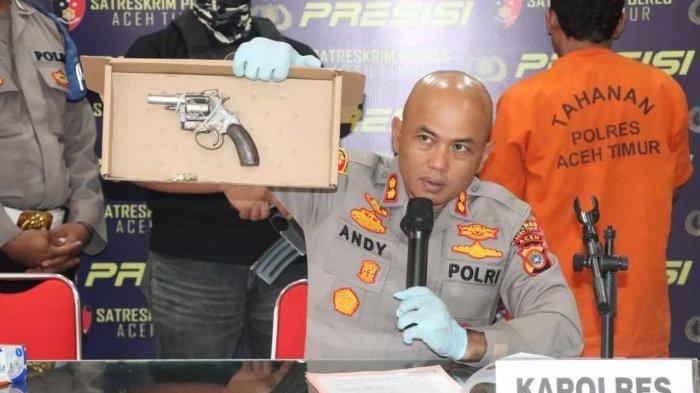 Kapolres Aceh Timur AKBP Andy Rahmansyah SIK, didampingi Kasat Reskrim AKP Arif Sukmo Wibowo, memperlihatkan senjata api yang diamankan dari pelaku yang melakukan pengancaman menggunakan senjata api, Jumat (5/5/2023).