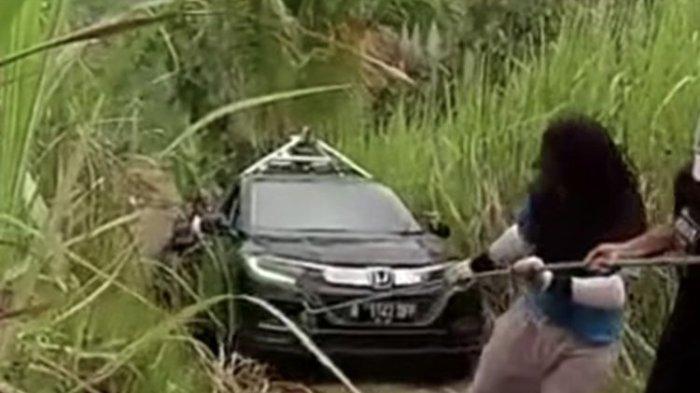Viral rekaman video memperlihatkan mobil Honda HR-V dengan nomor polisi B 1142 DFP ditarik warga menggunakan tali, viral di media sosial.