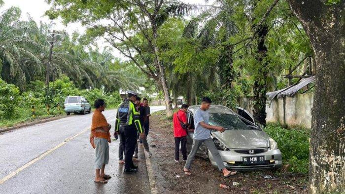 Kali ini, mobil Honda Jazz BL 1436 EG menabrak pohon di pinggir jalan tersebut.