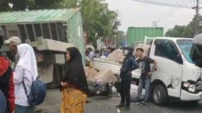 "Gandengan (boks) kontainernya jatuh ke sebelah kanan dan menimpa pikap dan dua (sepeda) motor yang mengakibatkan korban luka luka dan kerugian materil," jelasnya.