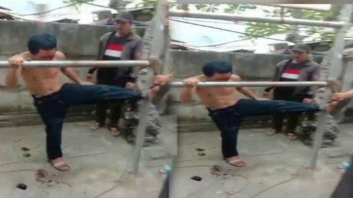 Dalam rekaman video, terlihat warga mengikat tangan dan kaki pelaku ke sebuah tiang.