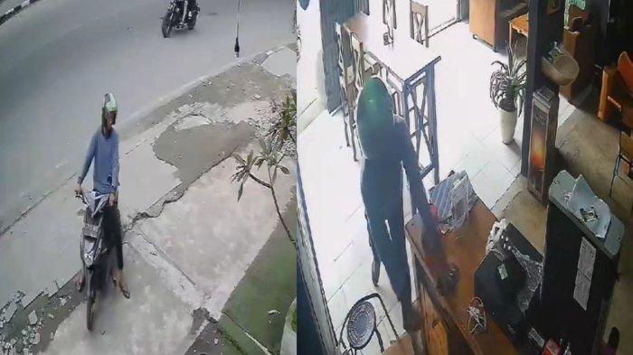 Aksi pencurian diĀ salah satu kafe di Medan, dimana seorang pria yang mengenakan helm ojek online (ojol) mencuri satu unit handphone milik karyawan